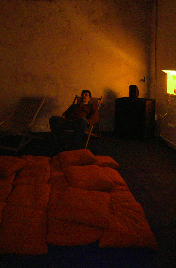 Installation, pièce sonore, vidéo, spatialisée en multidiffusion, chambre noire et transat.